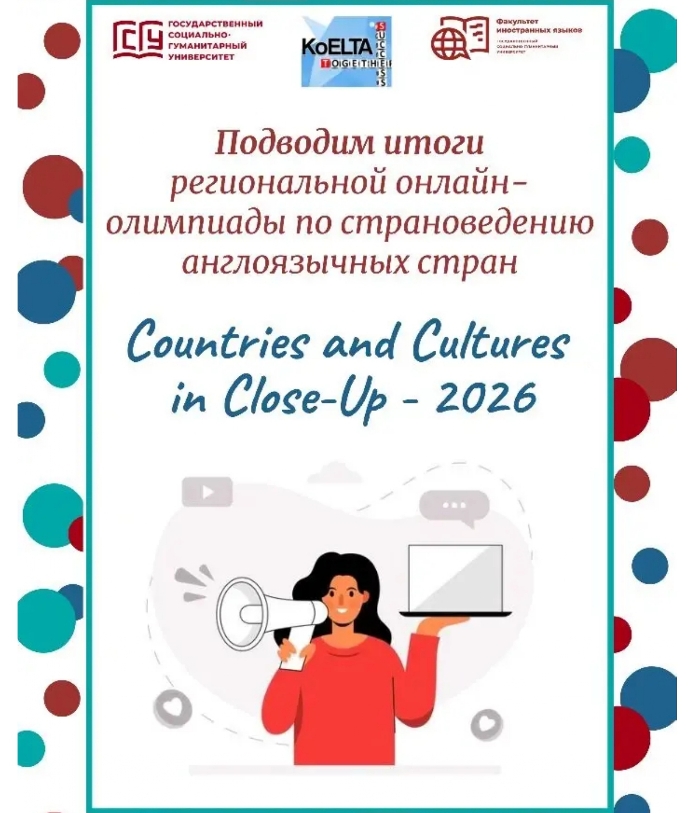 14 марта 2026 года кафедра лингвистики и межкультурной коммуникации факультета иностранных языков ГОУ ВО МО «ГСГУ» провела ежегодную региональную онлайн-олимпиаду по страноведению англоязычных стран «Countries And Cultures In Close-Up» для школьников СОШ и студентов ССУЗов Московской области, в которой приняли участие 699 учащихся из г. Москвы и Московской области (п. Белозерский, г. Бронницы, г. Воскресенск, г. Дмитров, г. Егорьевск, г. Зарайск, г. Звенигород, г. Коломна, г. Шатура, г. Луховицы, г. Люберцы, г. Озеры, г. Орехово-Зуево, г. Раменское, г. Ступино, г. Электросталь), а также из других населенных пунктов РФ: из г. Курск (Курская область), г. Мичуринск (Тамбовская область), г. Балашов (Саратовская область), что свидетельствует об обширной географии мероприятия.